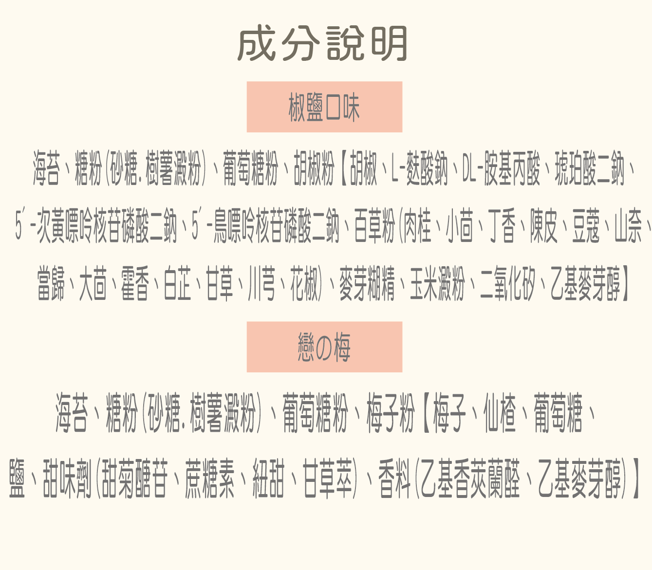 成分:海苔、糖粉(砂糖.樹薯澱粉)、葡萄糖粉、梅子粉【梅子、仙楂、葡萄糖、鹽、甜味劑(甜菊醣苷、蔗糖素、紐甜、甘草萃)、香料(乙基香莢蘭醛、乙基麥芽醇)】